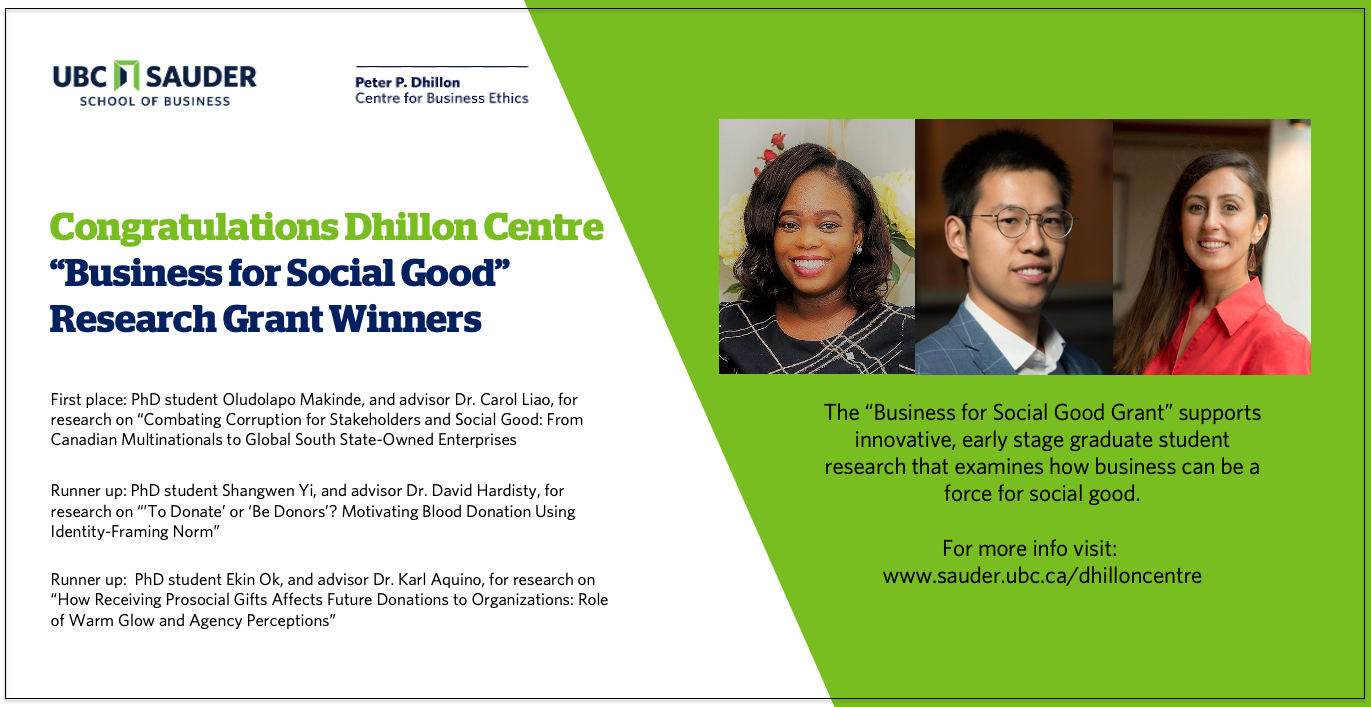 The Dhillon Centre for Business Ethics at UBC Sauder is pleased to announce the winners of its 2020 “Business for Social Good” research grant program: