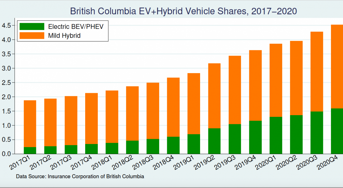 The above shares look small, but vehicle fleets turn over slowly. The average car lasts about 12 years, and thus we see about 8%–9% of vehicles turning over every year. Much then depends on the share of EV among new vehicles. The next diagram shows the market share of EVs and hybrid vehicles for vehicles appearing newly-registered on B.C.'s roads and having been built in the current or previous year (model years). Here the picture looks much rosier. The year 2020 saw the share of EVs rise, topping 9% in the first quarter of 2020 but (likely due to the influence of the pandemic as well as seasonal factors) falling to 5.2% by the fourth quarter.